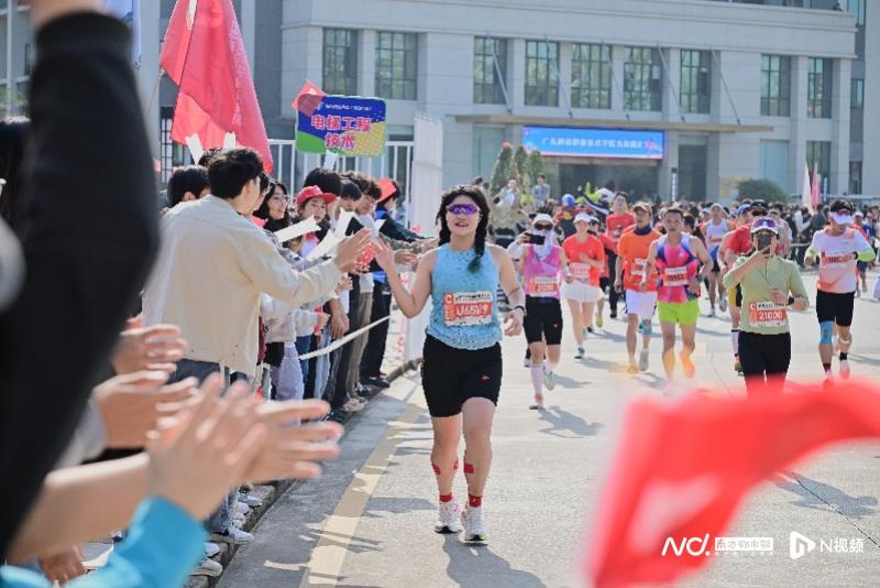 清远大学城的学生们为跑者加油打气。